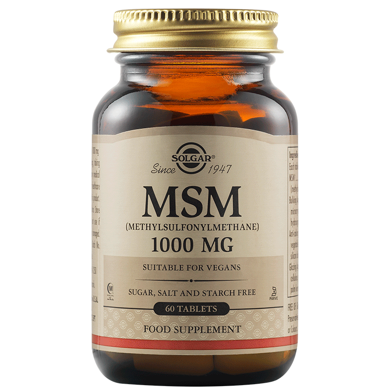 Solgar® MSM 1000 mg съдържа MSM (метилсулфонилметан), органично сярно съединение и едно от най-често срещаните вещества, намиращи се в организма, което е и градивен елемент на костите и ставите. Метилсулфонилметанът осигурява сяра, която е необходима за много различни основни функции в тялото. Той играе важна роля в производството на глюкозамин, който е важен за костите и ставите. Глюкозаминът присъства естествено в костите и хрущялите и се счита за градивен елемент за ставите и хрущялите. МСМ може да се намери в някои храни като зелени зеленчуци, но се унищожава дори при умерена обработка. Solgar® MSM 1000 mg гарантира, че получавате тази съществена органична сяра за вашето ежедневно благосъстояние. Всички продукти на Solgar® отговарят на признатия в нашата индустрия "Златен стандарт" за върхови постижения. Създадени използвайки естествено извлечени съставки и иновации, от 1947 г. насам, Solgar® са перфектните добавки за Вас и Вашето здраве - 98% от потребителите на Solgar® препоръчват марката * * Global Praxis онлайн проучване сред потребителите през 2017 г., което включва 3,882 VMS потребителите. Хранителни добавки не трябва да се използват като заместител на разнообразната и балансирана диета.