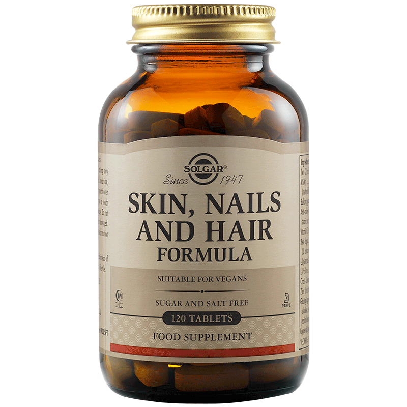 Хранителният дисбаланс, стресът, липсата на сън и други фактори на околната среда могат да повлиаят състоянието на кожата, косата или ноктите, което води до липса на блясък и здравина. Помогнете да поддържате кожата, ноктите и косата си здрави с формулата на Solgar® Skin Nails & Hair. Това е идеалната формула за ежедневна грижа за красотата ви, съдържаща цинк, мед, OptiMSM®, силициев диоксид (от червени водорасли), аминокиселини и витамин С. Продуктът е предназначен да помогне за изграждането на колаген, основен компонент на кожата, а също така за поддържане на здрава коса и нокти. Премиум формулата за ежедневна грижа за красотата съдържа основни хранителни вещества в подкрепа на кожата, ноктите и здравето на косата, включително цинк, мед и витамини, подкрепящи младежкия блясък, както и витамин С, който помага производството на колаген и еластичността на кожата, като предотвратява увреждането на кожните клетки, както и преждевременното стареене. Поддържаща тена на кожата и цвета на косата, медта допринася за нормалната пигментация, както и за защита на клетките от оксидативен стрес. Също така осигурява MSM, силициев диоксид под формата на червени водорасли на прах (L corallioides, силициев диоксид) и аминокиселини (L-лизин и L-пролин). Витамин С допринася за нормалното образуване на колаген и нормалната функция на кожата, както и за защита на клетките от оксидативен стрес. Цинкът допринася за поддържане на нормални кожа, нокти и коса, както и защитата на клетките от оксидативния стрес. Всички продукти на Solgar® отговарят на признатия в нашата индустрия "Златен стандарт" за върхови постижения. Създадени използвайки естествено извлечени съставки и иновации, от 1947 г. насам, Solgar® са перфектните добавки за Вас и Вашето здраве - 98% от потребителите на Solgar® препоръчват марката * * Global Praxis онлайн проучване сред потребителите през 2017 г., което включва 3,882 VMS потребителите. Хранителни добавки не трябва да се използват като заместител на разнообразната и балансирана диета.